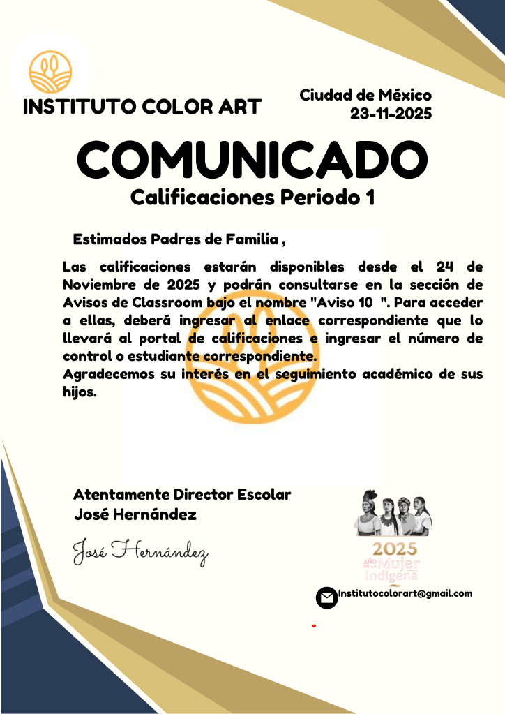 No. 01/25-26 Las calificaciones estarán disponibles desde el 24 de Noviembre de 2025 y podrán consultarse en la sección de Avisos de Classroom bajo el nombre «Aviso 10 «. Para acceder a ellas, deberá ingresar al enlace correspondiente que lo llevará al portal de calificaciones e ingresar el número de control o estudiante correspondiente.